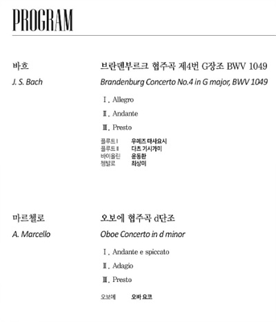 플루트1 우메즈 마사요시, 플루트2 다츠 기시가미, 쳄발로 최상미, 바이올린 윤동환, 오보에 오바 요코 등 17명